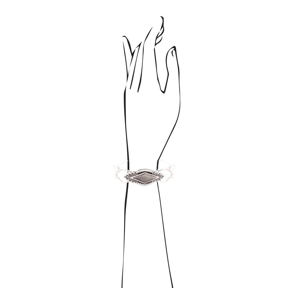 Black mother of pearl shimmers in a diamond shape surrounded by sterling silver in a delicate cuff bracelet. Top of bracelet is 1.75" across. Fits most wrists.