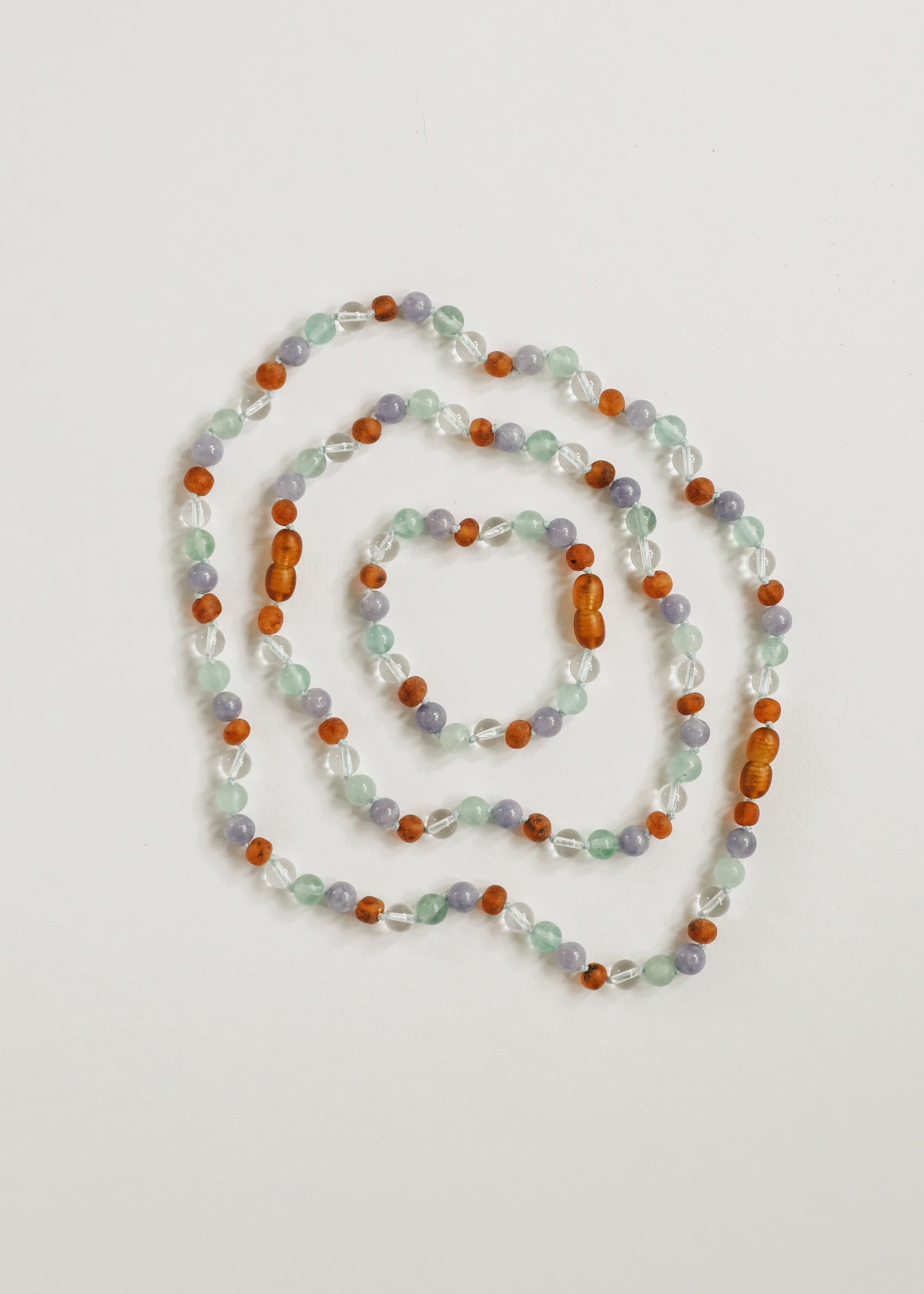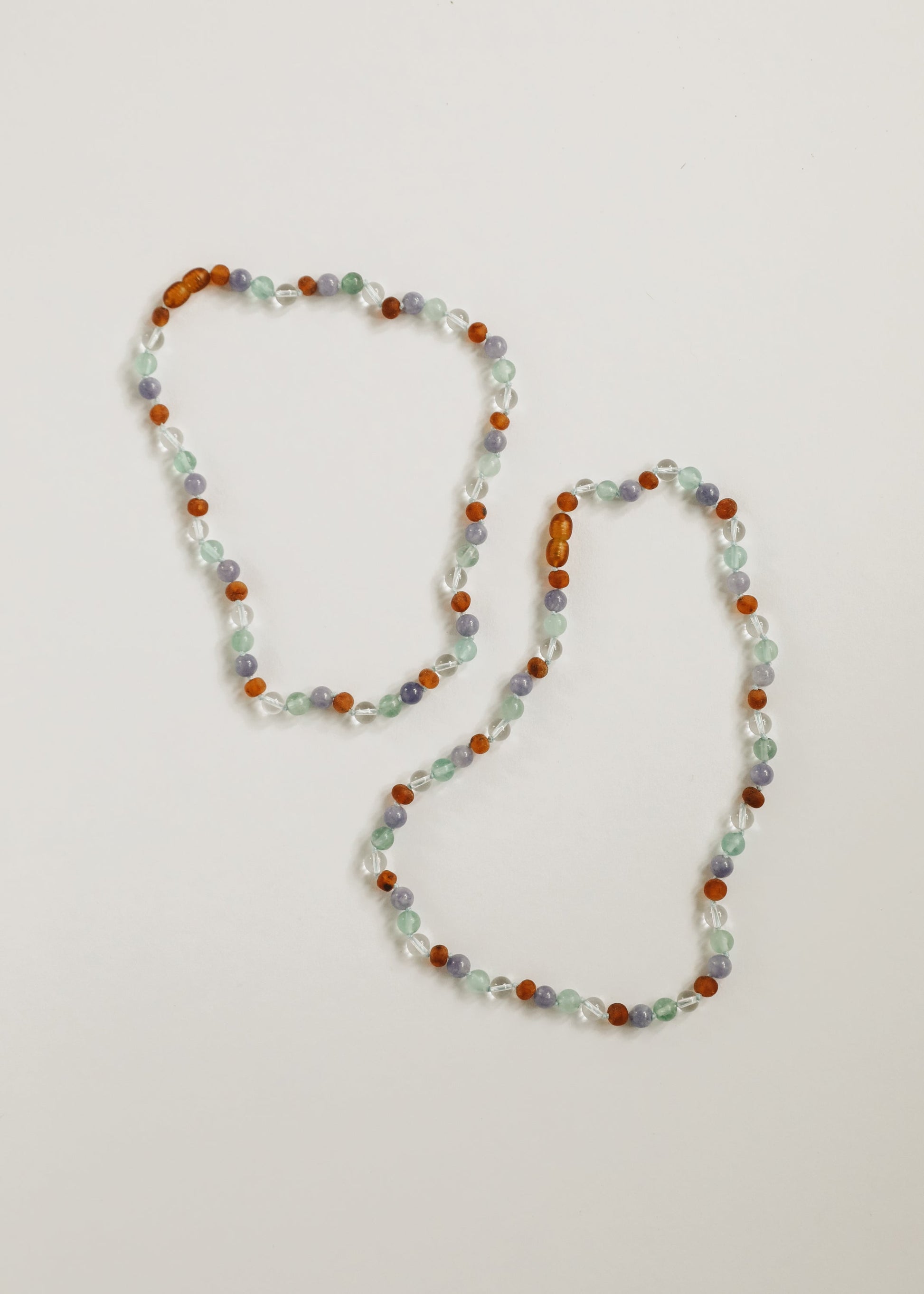 You will find Fluorite, Aquamarine, Clear Quartz and Cognac Baltic Sea Amber paired together for this special collection.