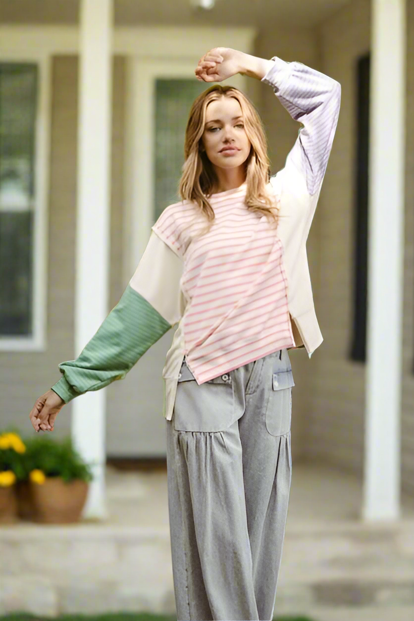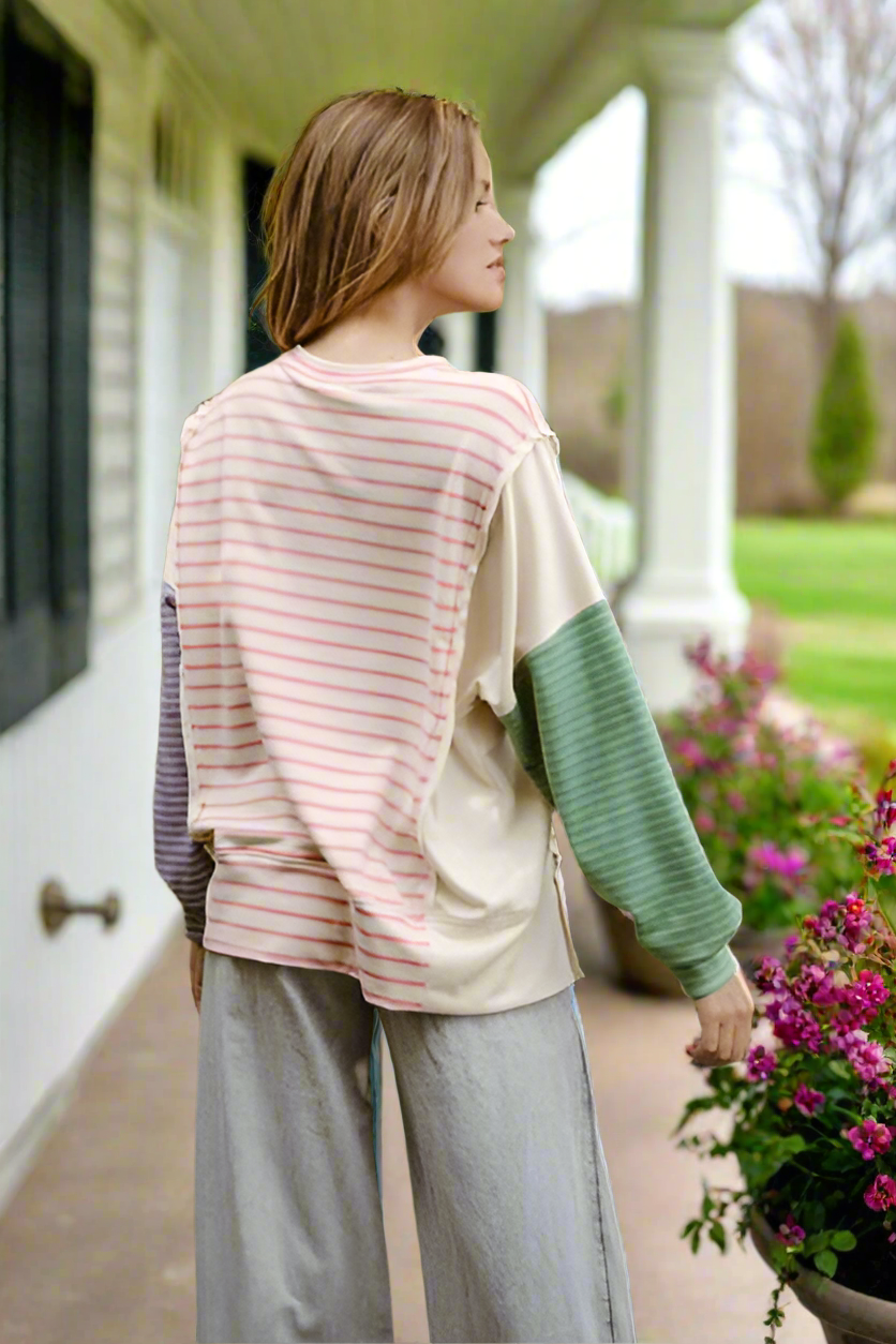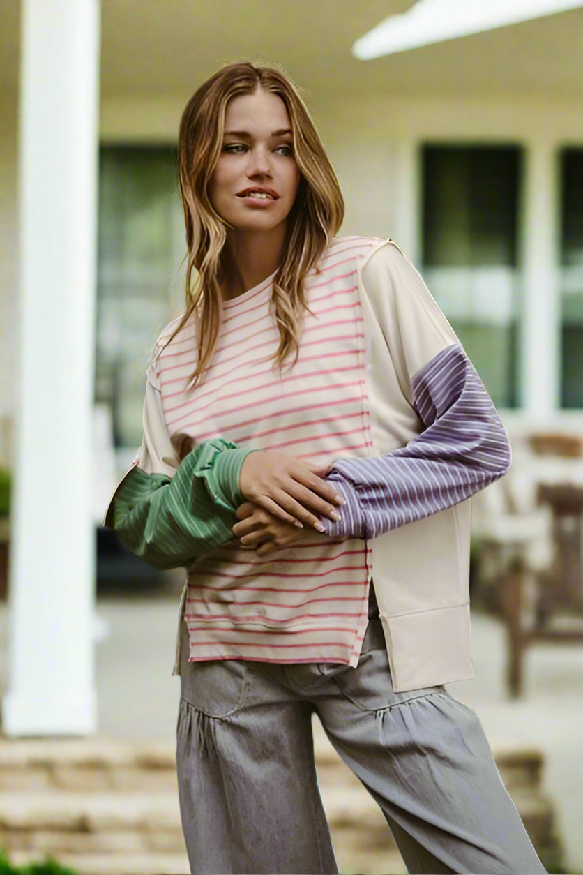 The Exposed Seam Slit Striped Round Neck T-Shirt is a modern and casual top. The striped pattern adds a classic and versatile element to the shirt. Featuring exposed seams and side slits, it offers a trendy and edgy detail to the design. With a round neck, it provides a simple and timeless neckline. This t-shirt is a stylish and easy-to-wear option for creating laid-back and contemporary outfits with a fashionable edge.