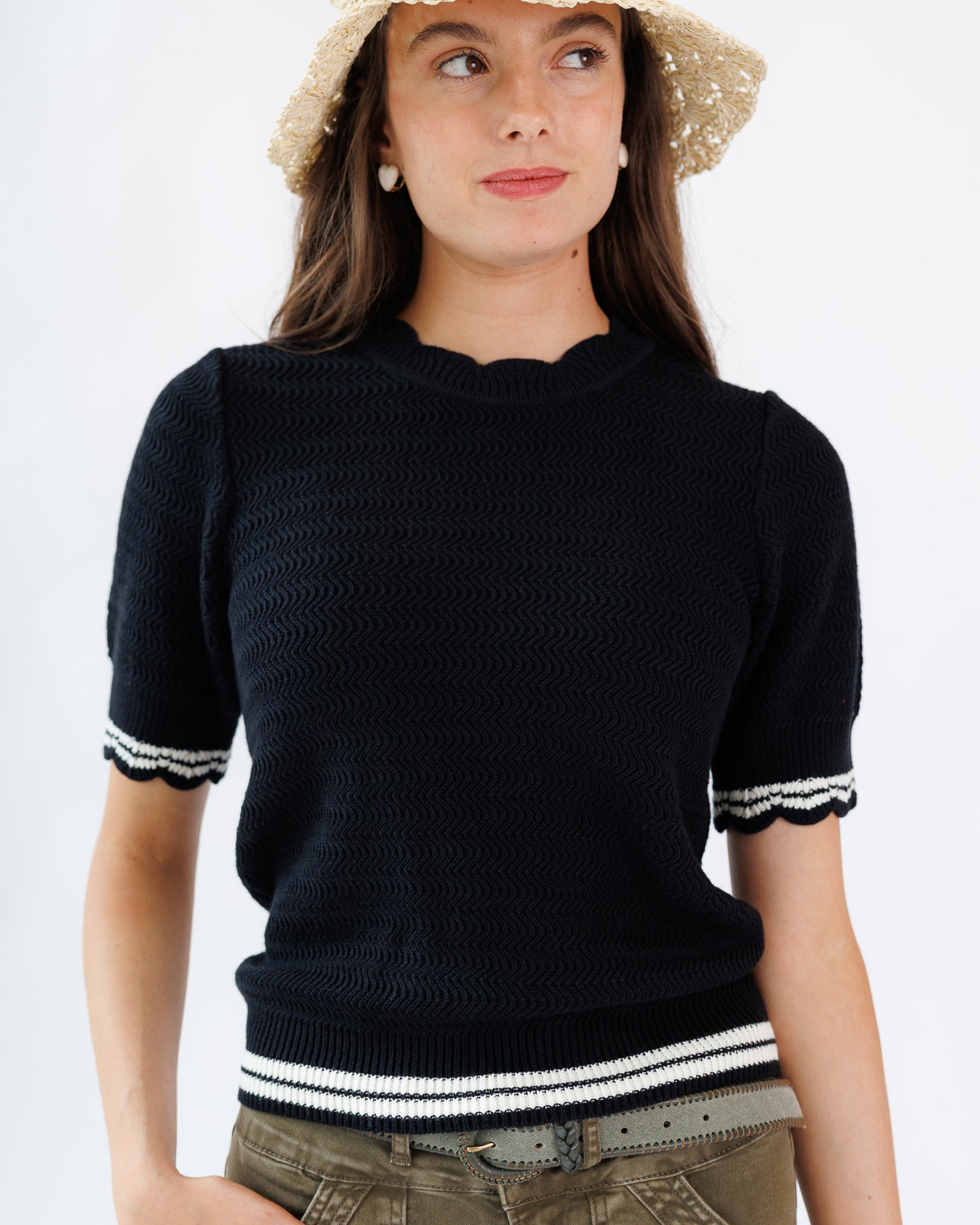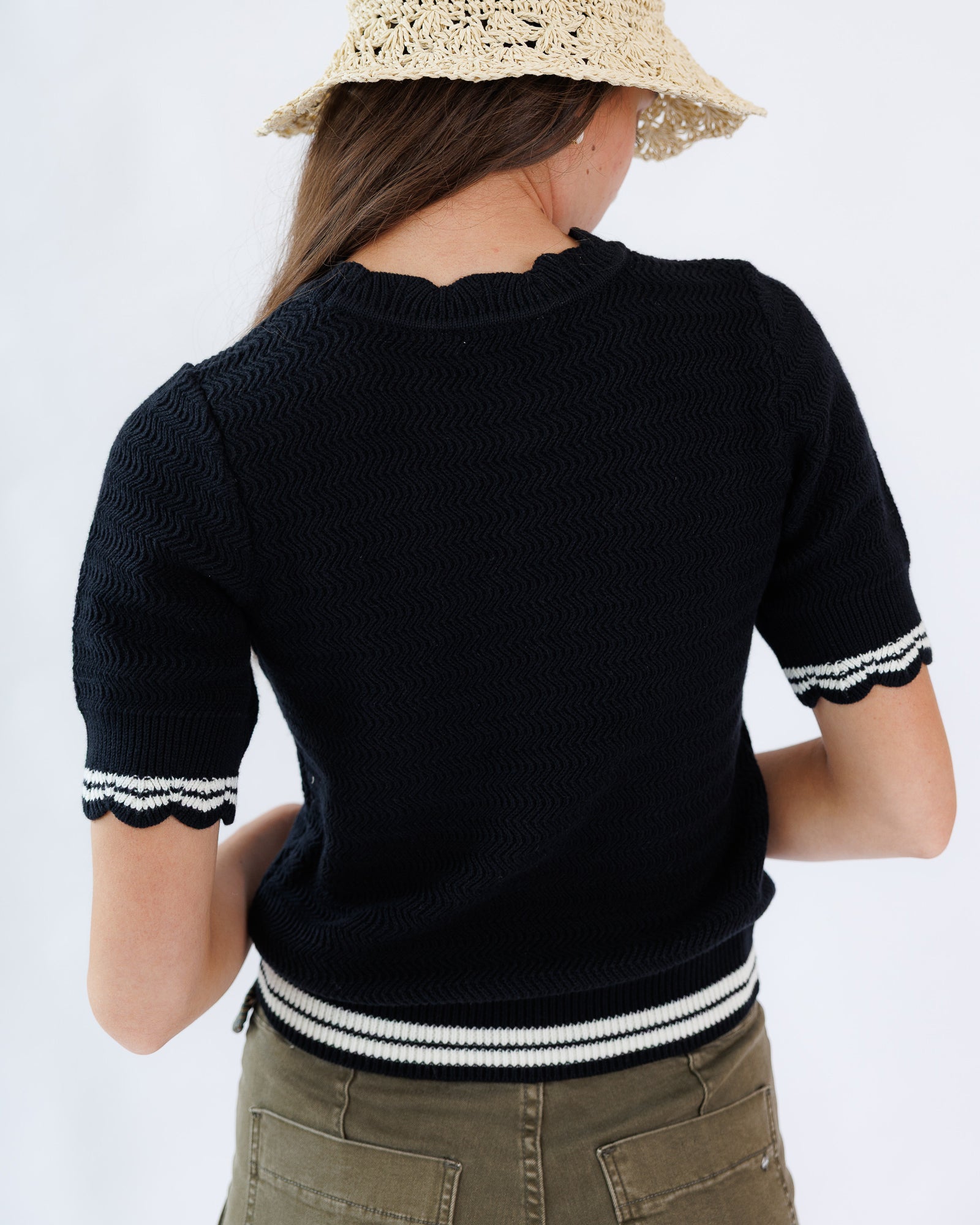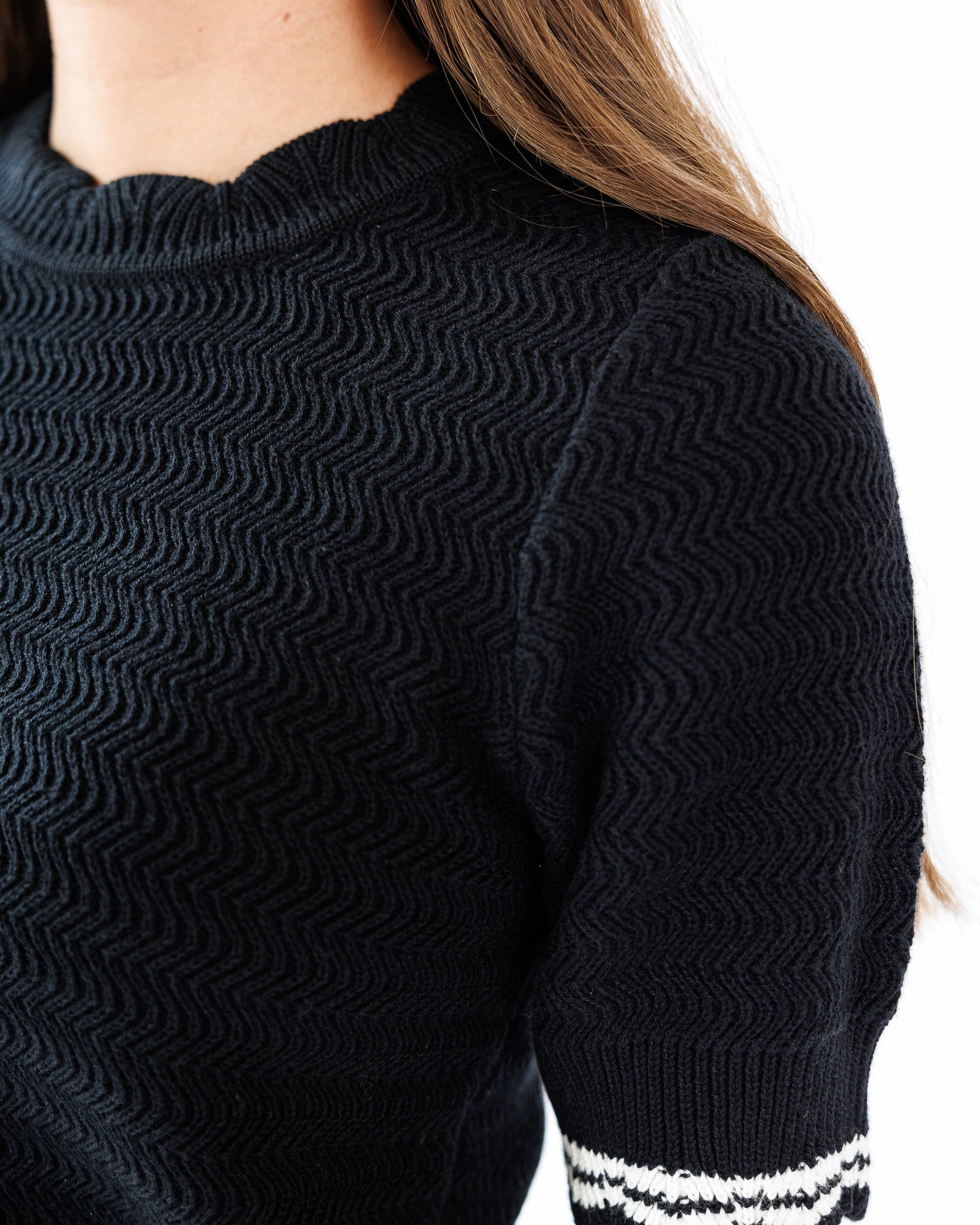 - Scalloped neckline and sleeves