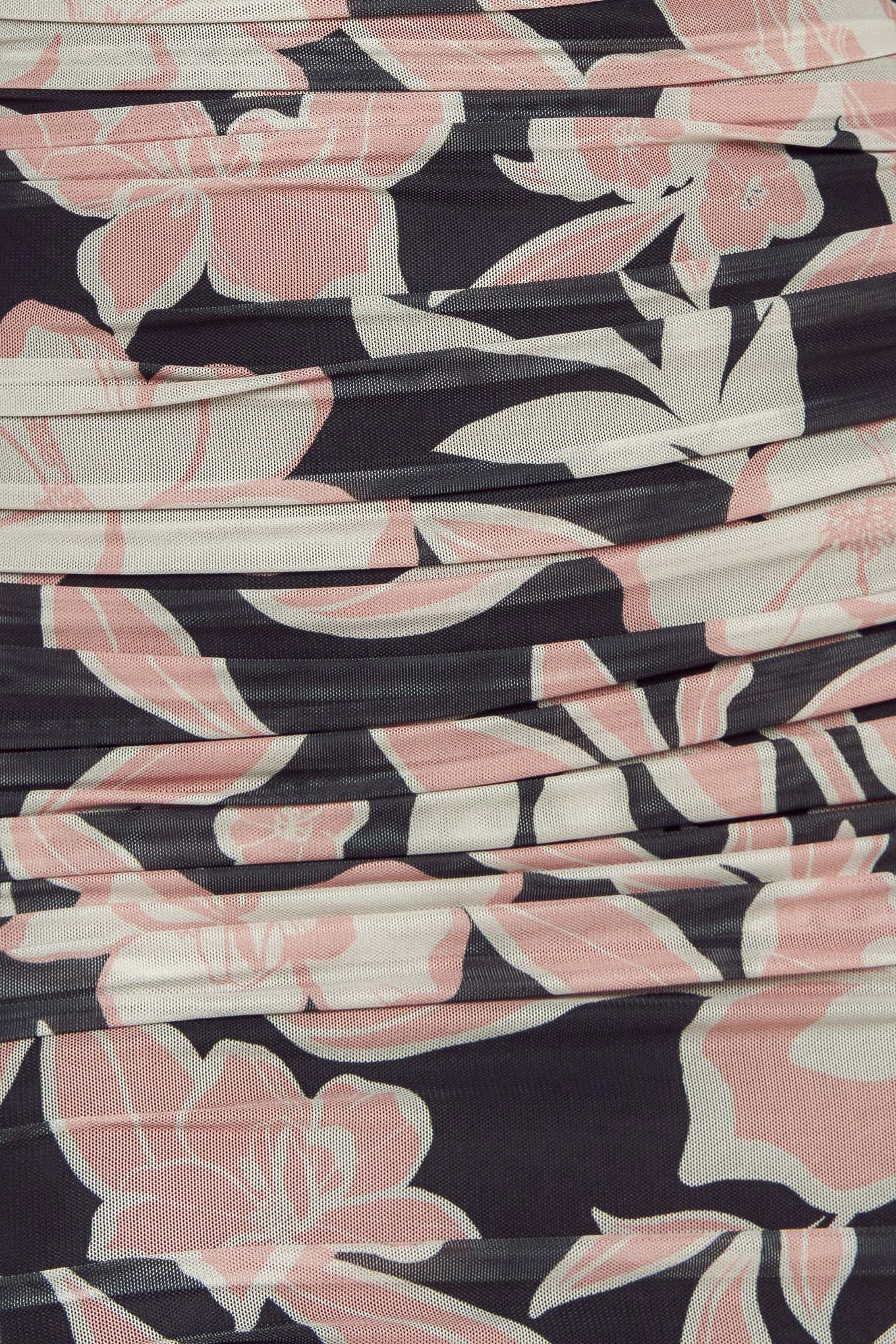 A printed power mesh midi dress featuring body contouring, long sleeve, shirred side and back zipper closure