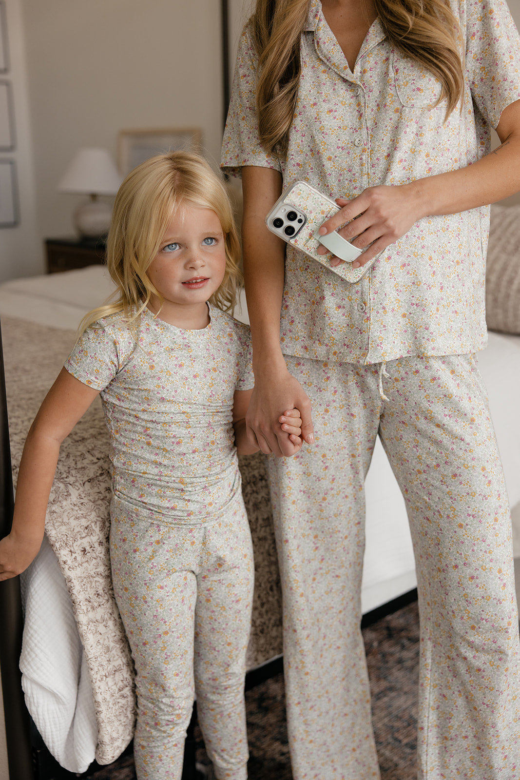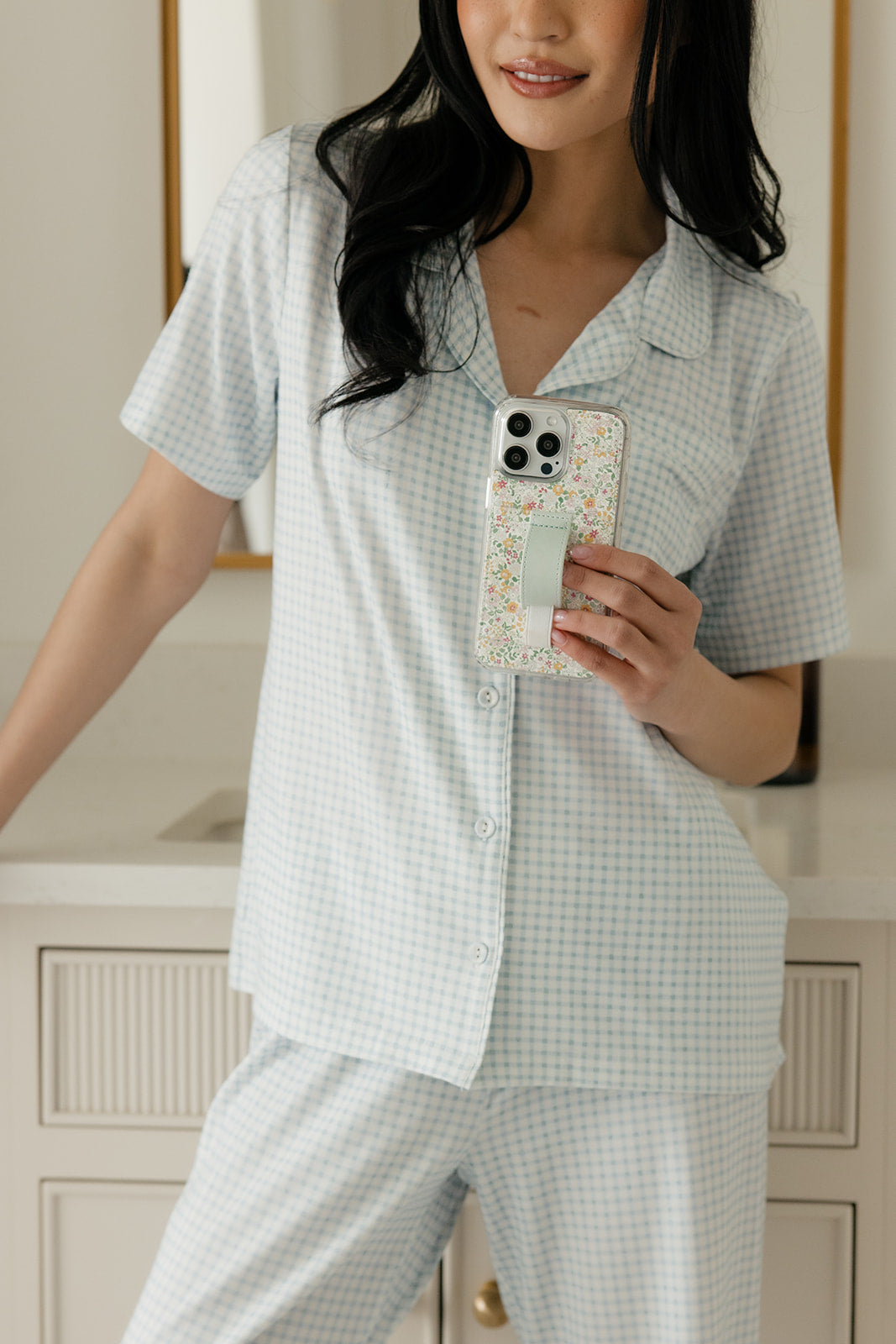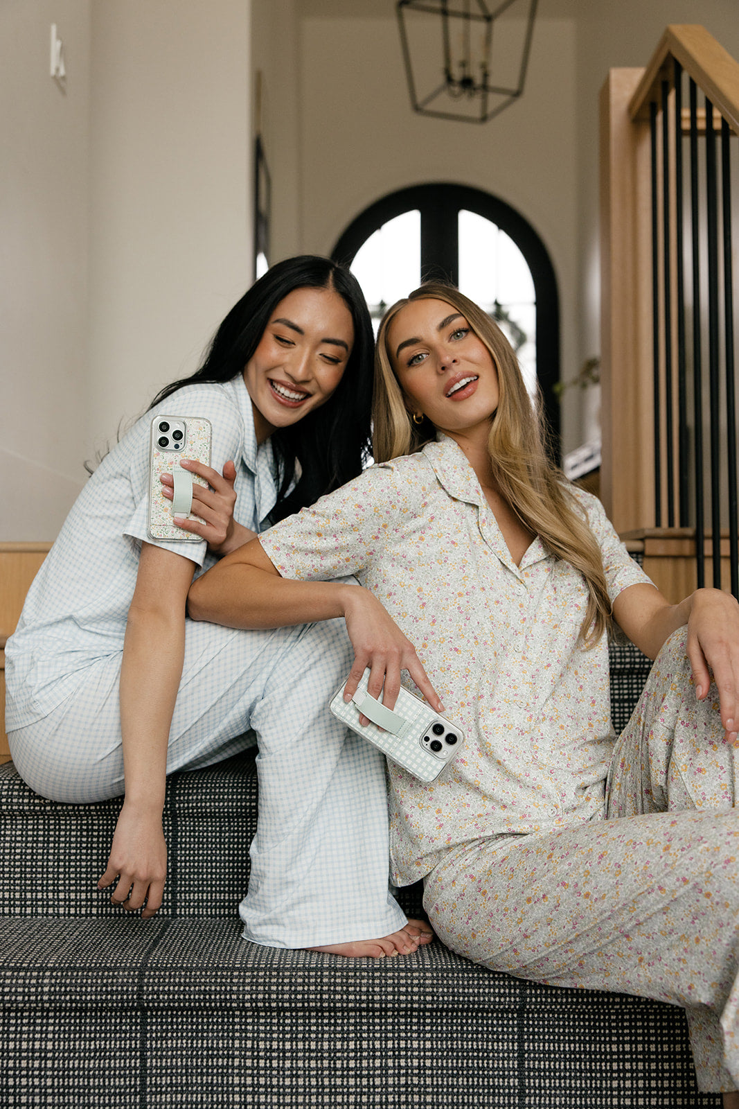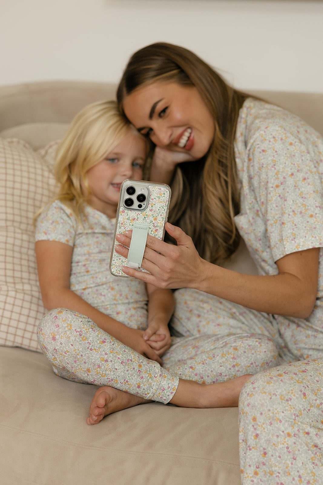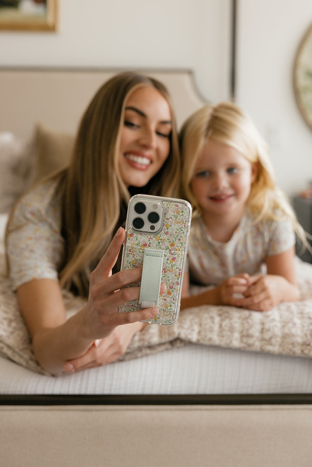 Case Design: Pink, blue and yellow flowers with a solid blue strap