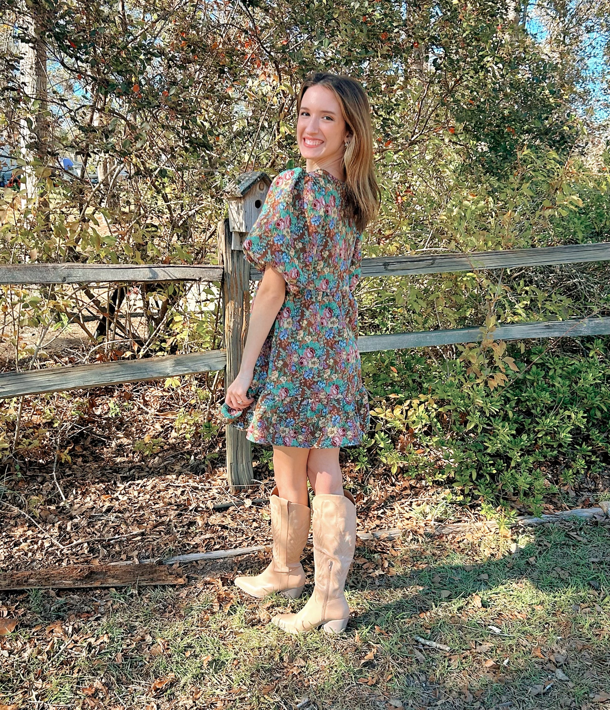 Get ready to turn heads in The Hannah Dress! This beautiful and feminine floral jacquard mini dress features browns and blues with a beautiful puff sleeve design and a flattering flouncy cut. Perfect for any occasion, it'll make you feel confident and stylish. Go ahead! We give you full permission to love it! We do.