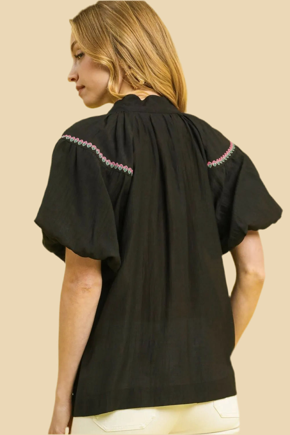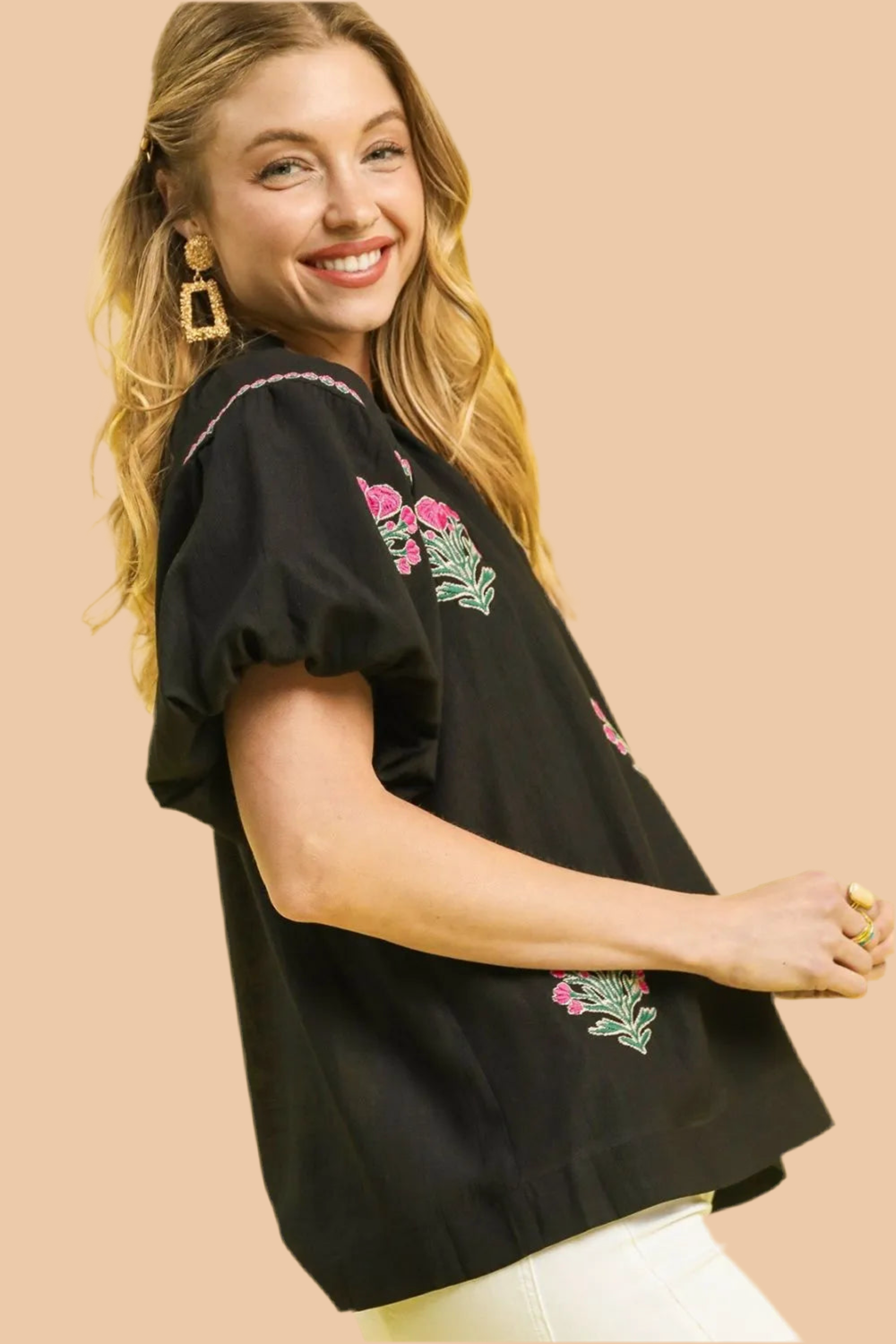Umgee Floral Embroidered Puff Sleeve Blouse