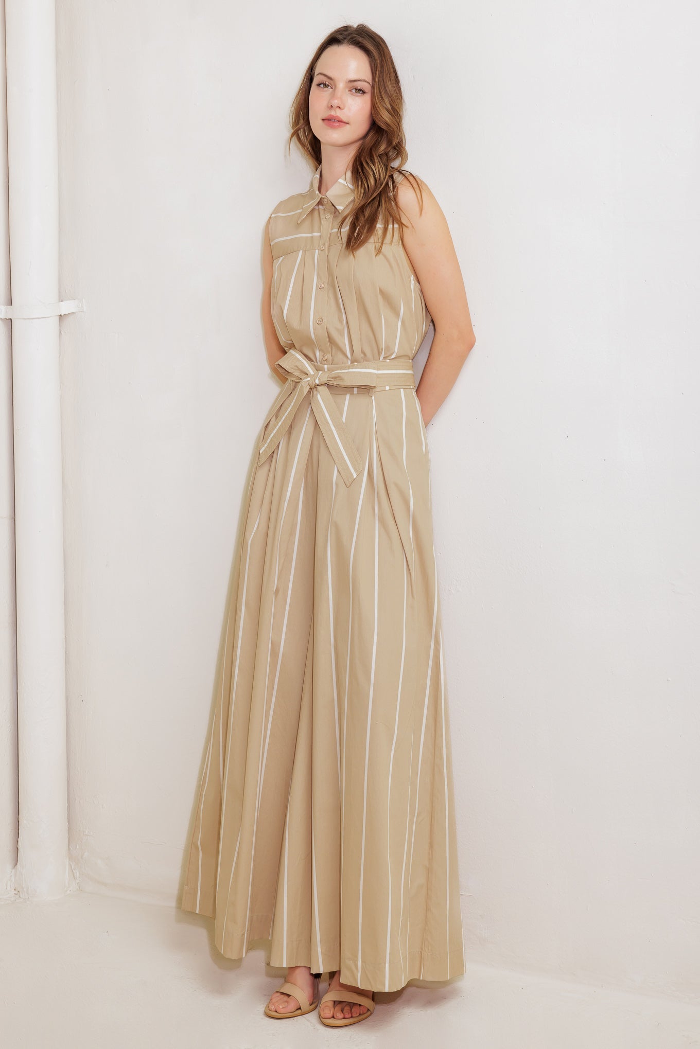 A striped woven pant featuring front pleat, self sash tie and extra wide leg.